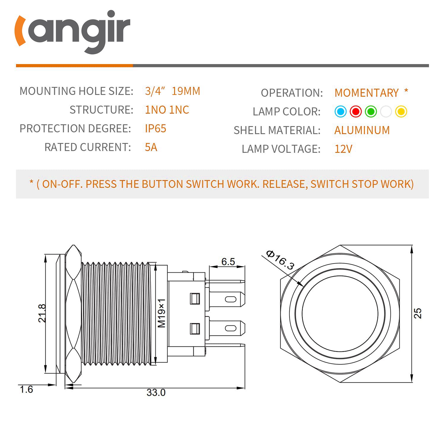 Dimensiunea găurii de montare: 12mm/16mm/19mm/22mm