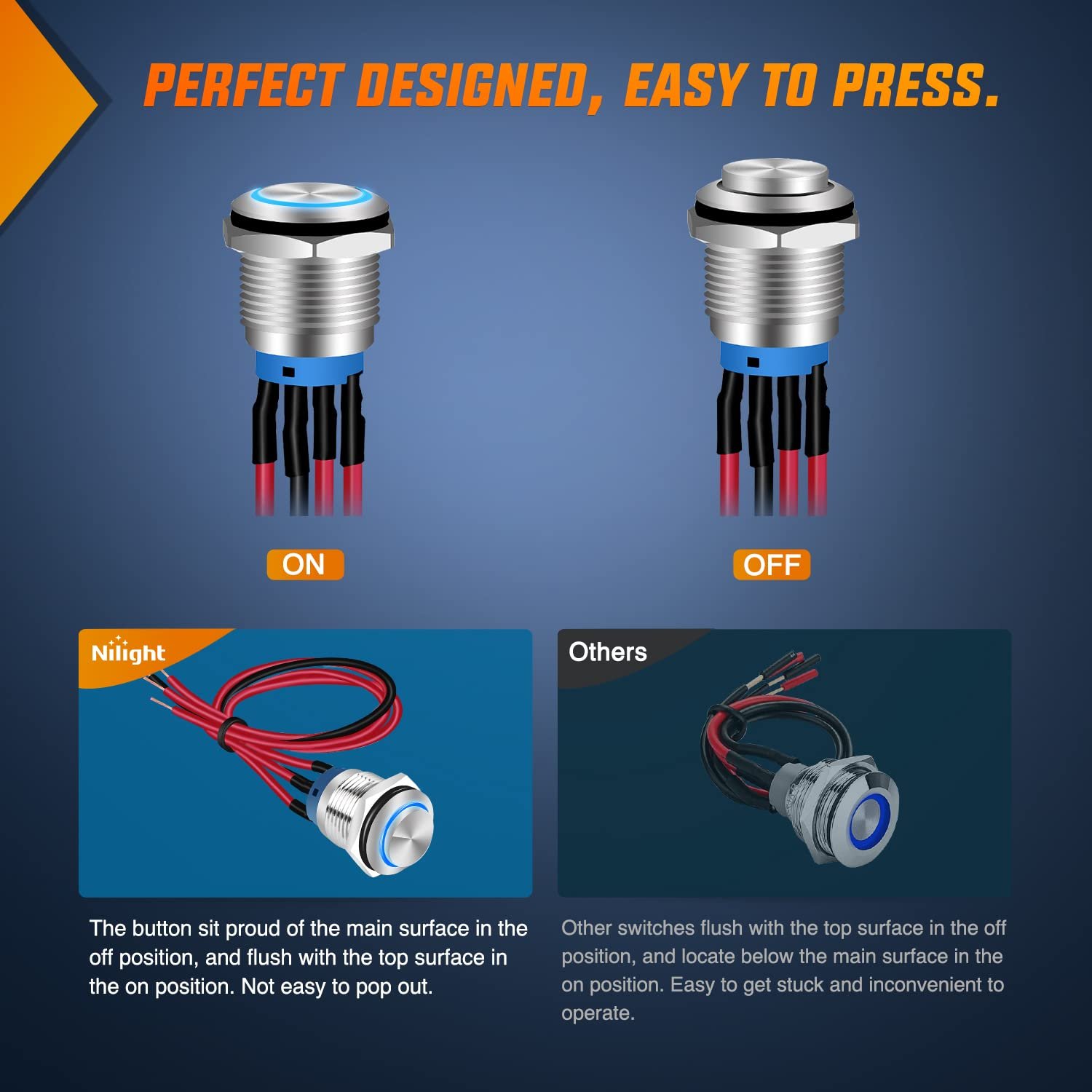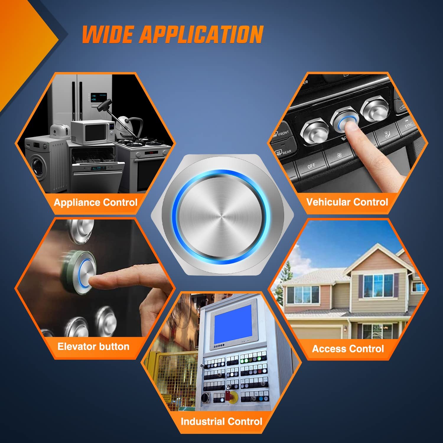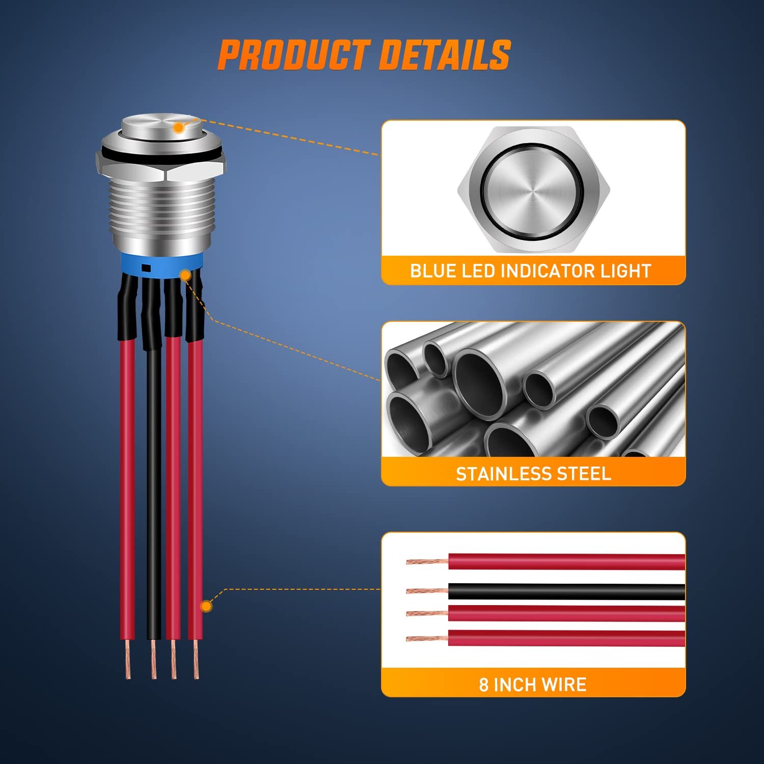 Stainless Steel LED Switches Self-Locking Latching Push Button Switches Pre-Wired Harness for 19mm for Boats Cars 12V Plastic